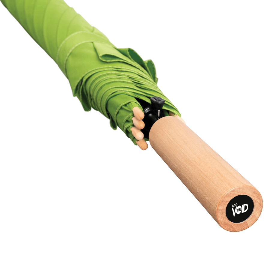 Attractively priced sustainable golf umbrella with cover material made of recycled plastics and genuine wood elements